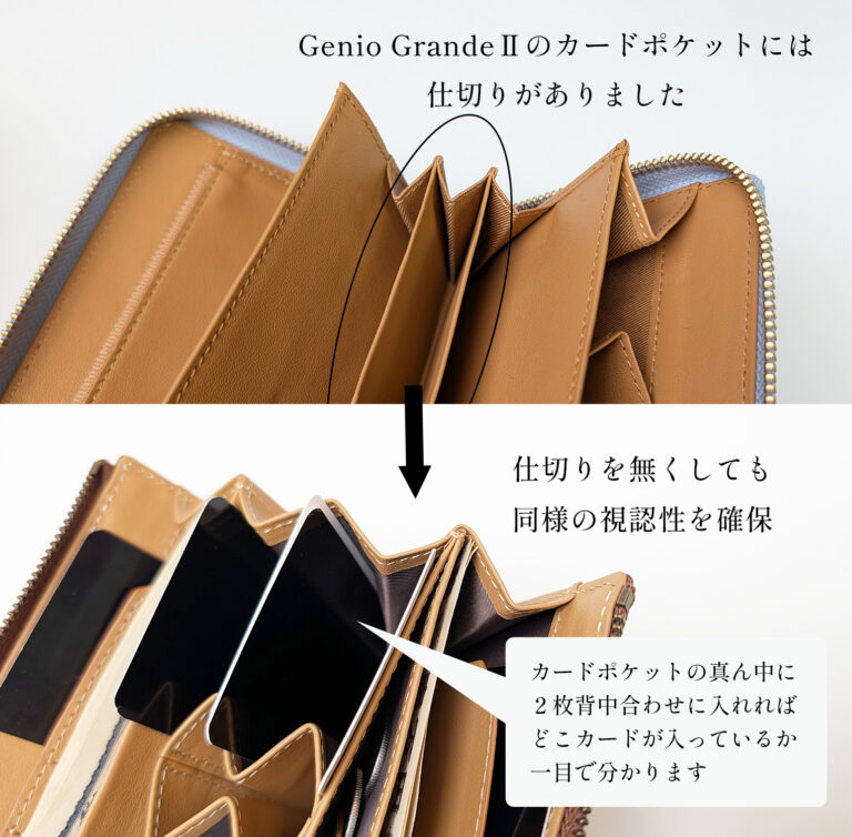 ジェニオ・グランデ2は、特許庁により意匠登録された、オリジナルデザインのカードポケット&パーテーションによる