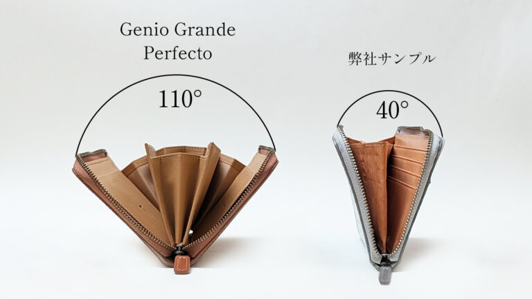 巷で人気のお財布は、30°〜40°程度しか開かないものも多いですが、Genio Grande Perfectoなら、110°以上開きます。