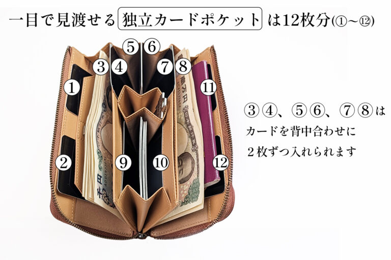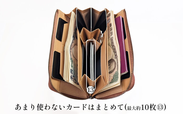 独立カードポケット×12枚分、最大10枚のカードがまとめて入れられるマルチポケット、の組み合わせでした。